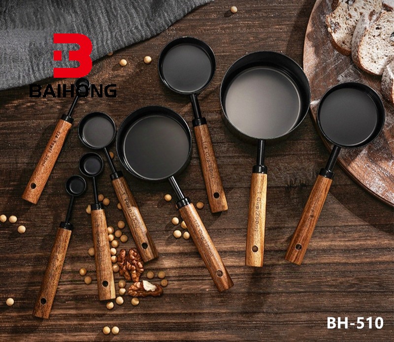 Item Nr: BH-510Material: 430 stainless steel with Titanium black,acacia wood handleCapacity: 250ml /125ml /80ml /60ml for cups /15ml /5ml /2.5ml /1.25ml for spoonsFeature: Perfect for measuring liquid, flour,pepper,coffee etc,Heat resistance & anti corrosionCertificate: FDAMOQ: 1000 setsPacking:...
